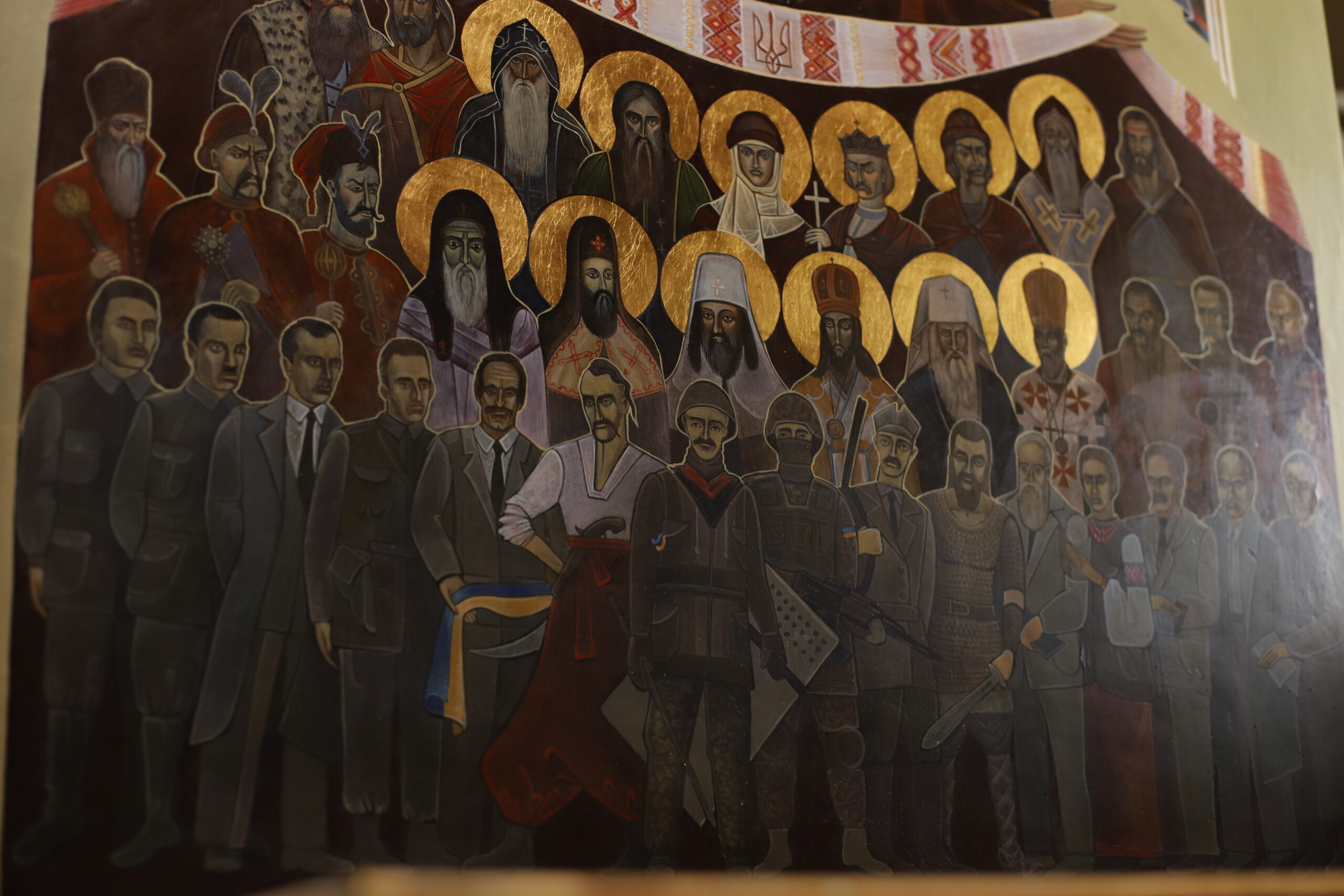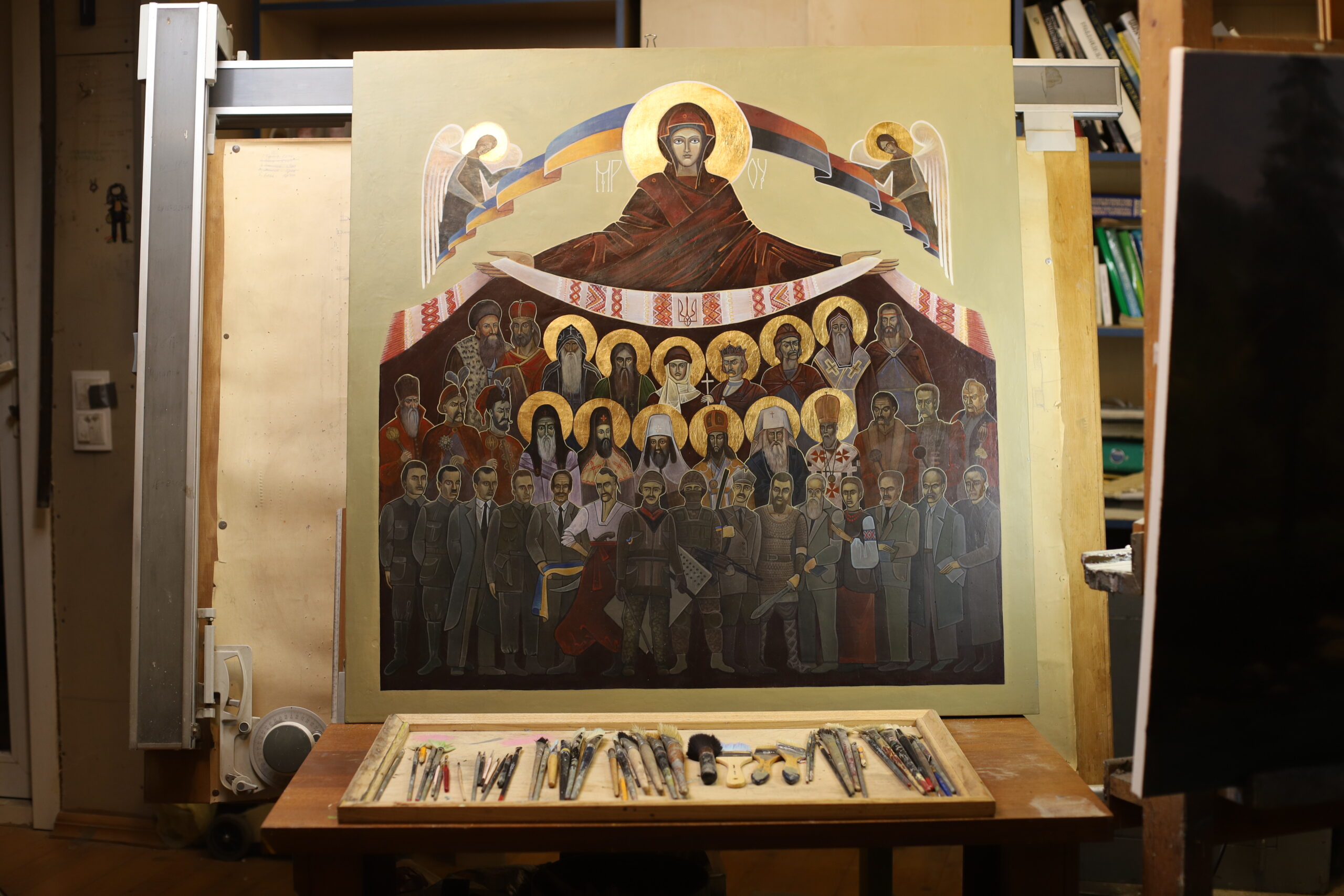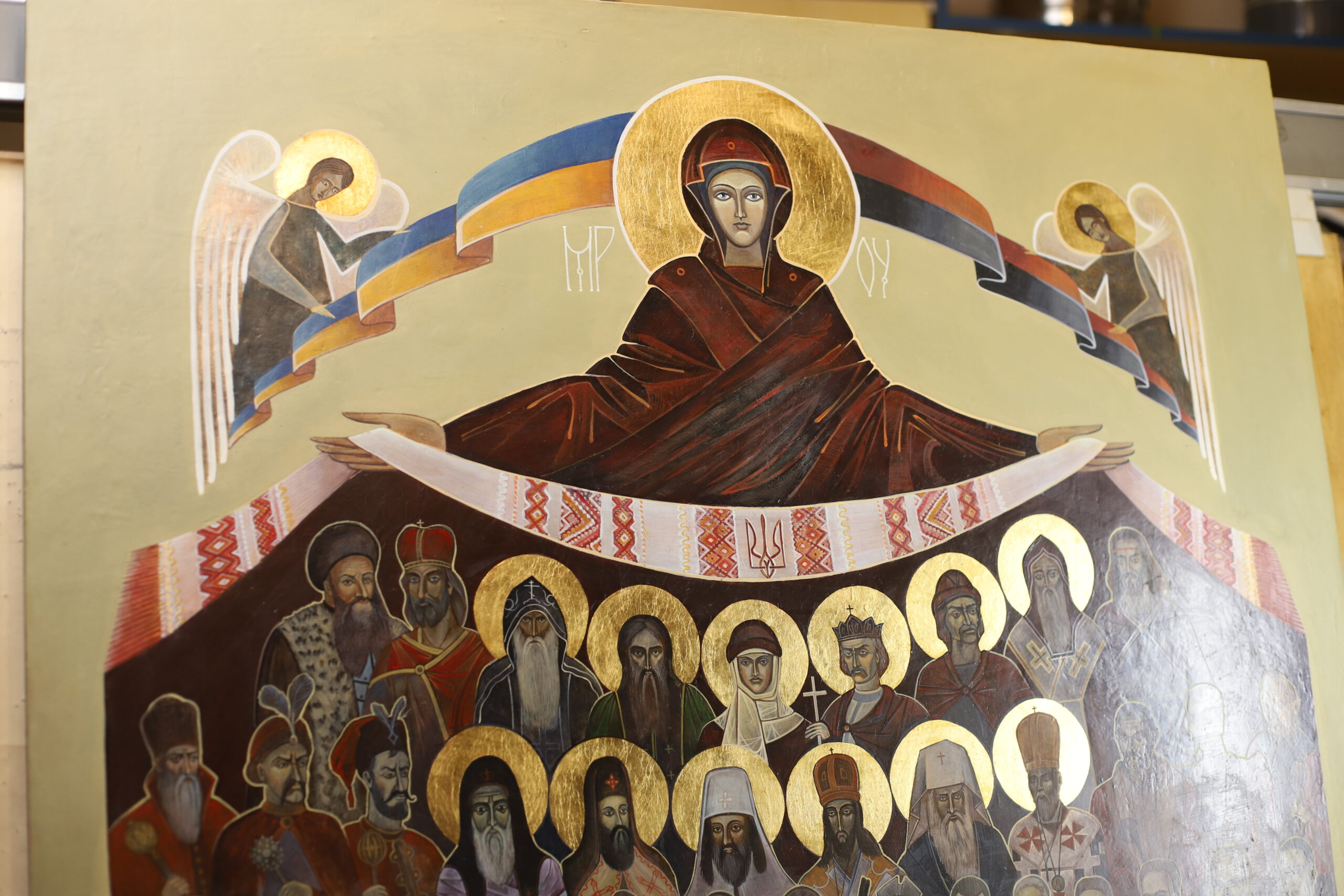 Кожен, хто пожертвує на теплі речі для наших військових від 100 гривень, зможе взяти участь у розіграші особливих лотів. Одним з них є ікона Покров Пресвятої Богородиці. Під омофором Матері Божої у три ряди зображені визначні постаті української історії – Леся Українка, Михайло Грушевський, Степан Бандера тощо.
