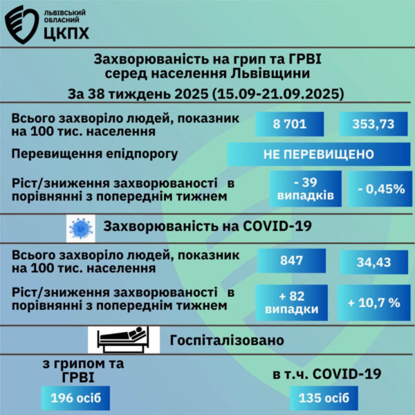 Загалом на коронавірус за минулий тиждень захворіли 847 мешканців області, що на 82 випадки більше, ніж попереднього тижня. За той самий період на грип та ГРВІ захворіли 8 701 мешканець Львівщини. У порівнянні з попереднім тижнем кількість хворих дещо знизилась — на 39 випадків (–0,45%). Епідеміологічний поріг не перевищений.