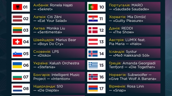Зазначимо, у першому півфіналі українці можуть голосувати за всіх учасників конкурсу, крім самих Kalush Orchestra. Під час прямого ефіру з’явиться інформація, коли можна буде надсилати sms-повідомлення на номер 7576 із номером учасника, за якого голосуєте.