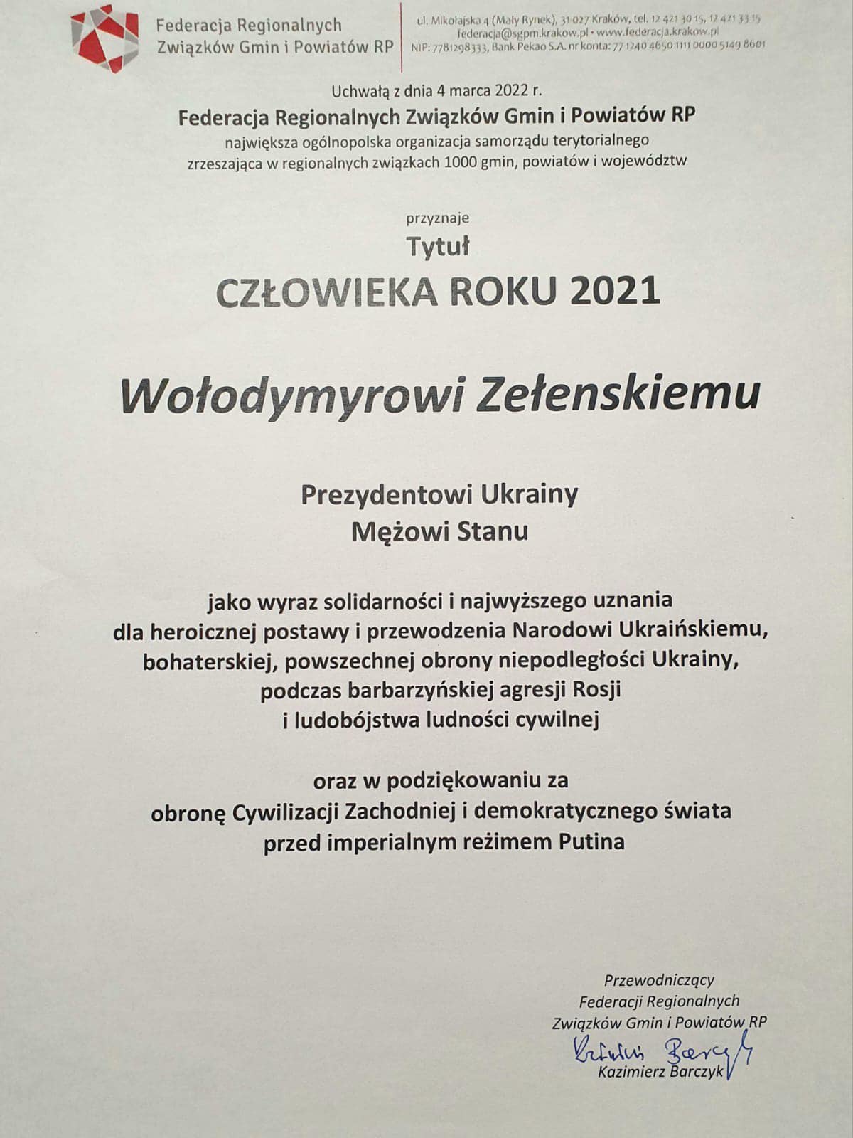 «Відповідно до рішення від 4 березня 2022 року Федерації регіональних об’єднань гмін і повітів Республіки Польща, її голова Казімєж Барчик на LI сесійному засіданні Малопольського сеймика 10.03.2022 року оголосив про надання президенту України Володимиру Зеленському титулу «Людина Року 2021» як вираз солідарності польського народу та найвищого визнання героїзму народу України», – йдеться в повідомленні генконсульства.