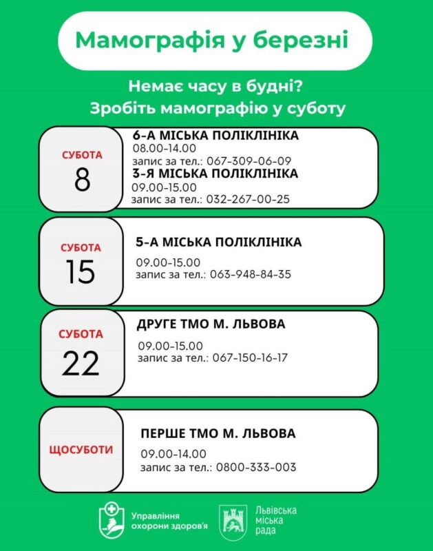 – Перше медичне об’єднання (вул. Мазепи, 2): 09:00-14:00, запис за тел.: 0800-333-003.